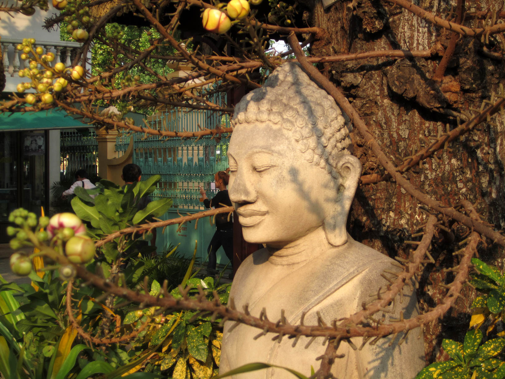 buddha statue in front of a "shorea robusta rob" tree - phnom penh, cambodia
