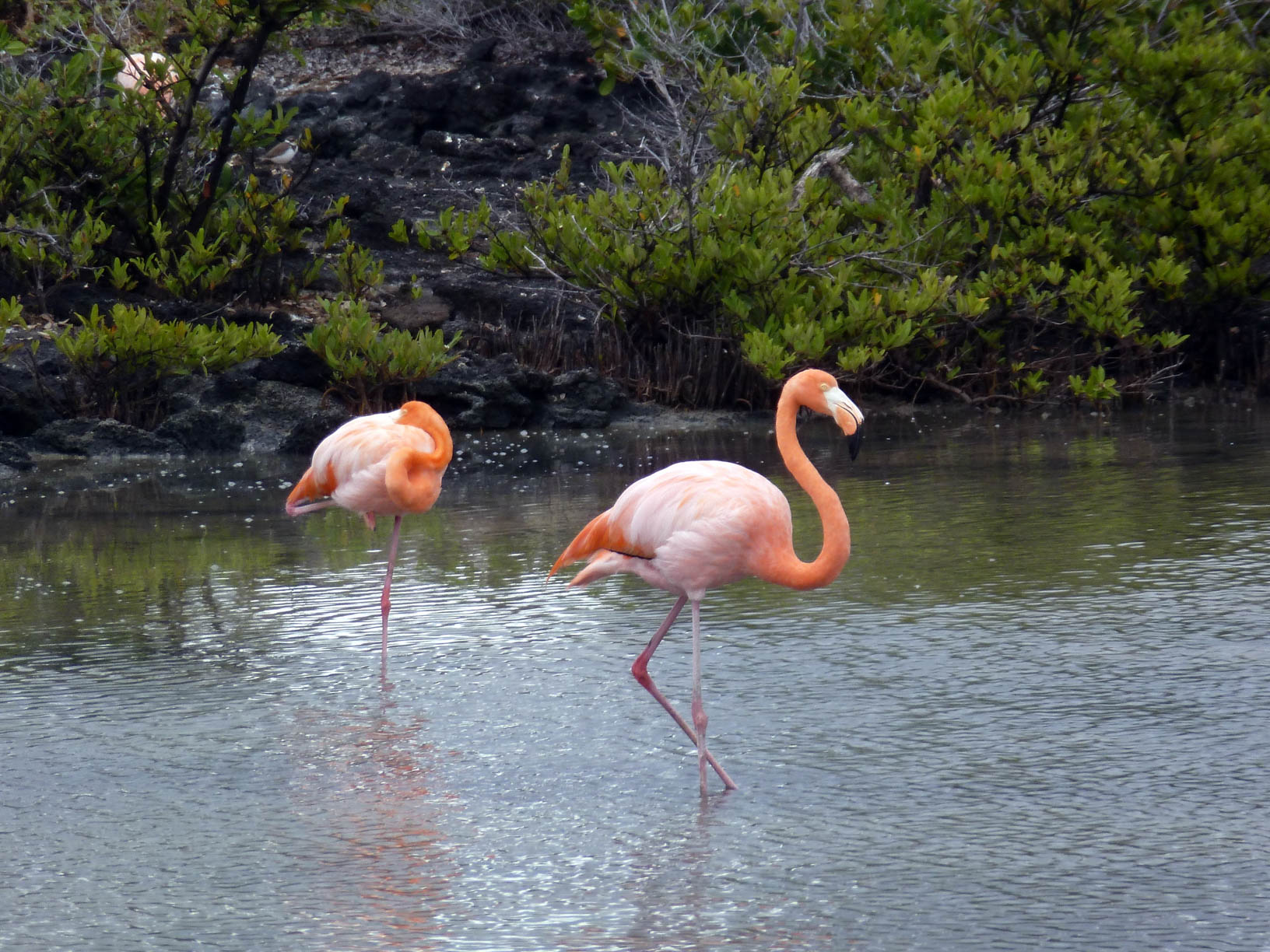 american flamingos, las bachas beach - santa cruz island, galapagos, ecuador